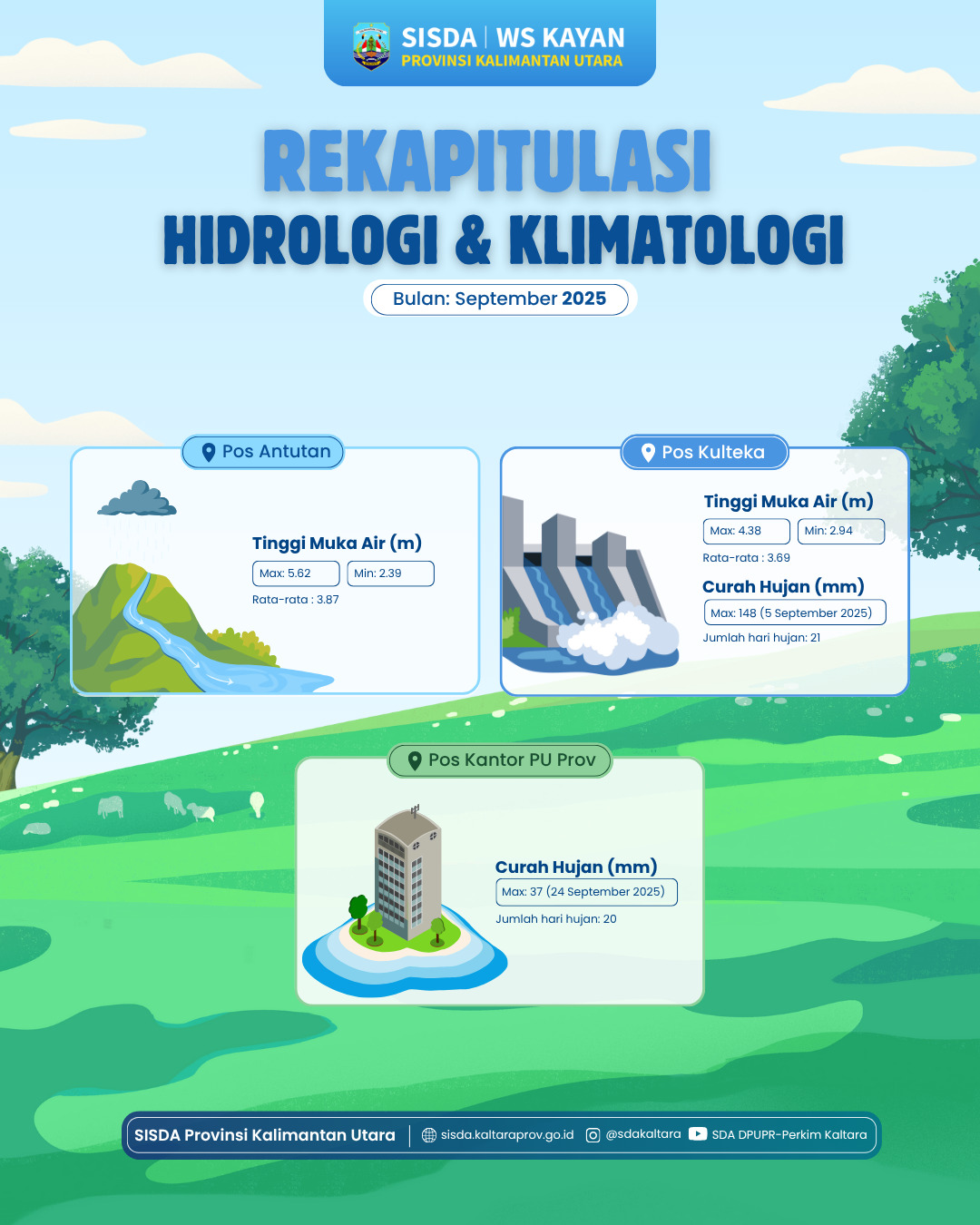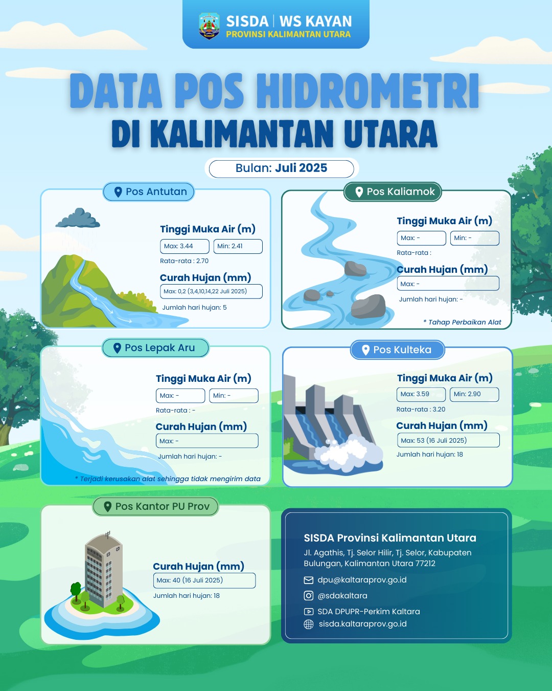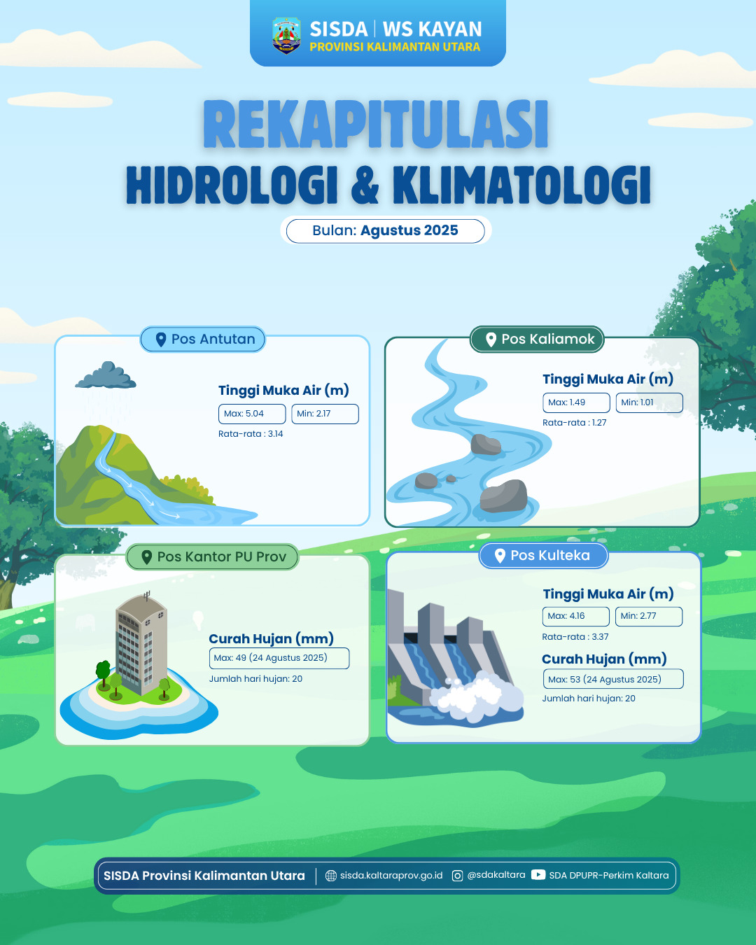 INFOGRAFIS | DATA POS HIDROMETRI MEI 2025 SISTEM INFORMASI SUMBER DAYA AIR (SISDA) WILAYAH SUNGAI KAYAN, DINAS PUPR-PERKIM PROVINSI KALIMANTAN UTARA, MERILIS DATA HASIL PEMANTAUAN HIDROLOGI BULAN MEI 2025. PEMANTAUAN INI MELIPUTI TINGGI MUKA AIR (TMA) DAN CURAH HUJAN (CH) PADA LIMA POS HIDROMETRI DI WILAYAH KALIMANTAN UTARA. 📍 REKAP DATA PER POS: POS ANTUTAN TMA: 3,84 – 7,10 M, RATA-RATA: 5,20 M POS KALIAMOK TMA: 0,96 – 2,53 M | RATA-RATA: 1,98 M, CURAH HUJAN: 62,5 MM (16 MEI), HARI HUJAN: 8 HARI (PERIODE 15–23 MEI) POS LEPAK ARU TMA: 3,87 – 7,32 M | RATA-RATA: 5,37 M, CURAH HUJAN: 104,5 MM (6 MEI), HARI HUJAN: 13 HARI (PERIODE 1–17 MEI) POS KULTEKA TMA: 3,67 – 4,99 M | RATA-RATA: 4,20 M, CURAH HUJAN: 33,4 MM (21 MEI), HARI HUJAN: 21 HARI POS KANTOR PU PROVINSI CURAH HUJAN: 24 MM (10 MEI), HARI HUJAN: 19 HARI PENCATATAN BULAN MEI 2025 PADA POS LEPAK ARU HANYA PADA TANGGAL 1-17 MEI 2025 DIKARENAKAN LOGGER TERENDAM BANJIR DAN MATI SEHINGGA TIDAK MENGIRIMKAN DATA TMA.